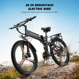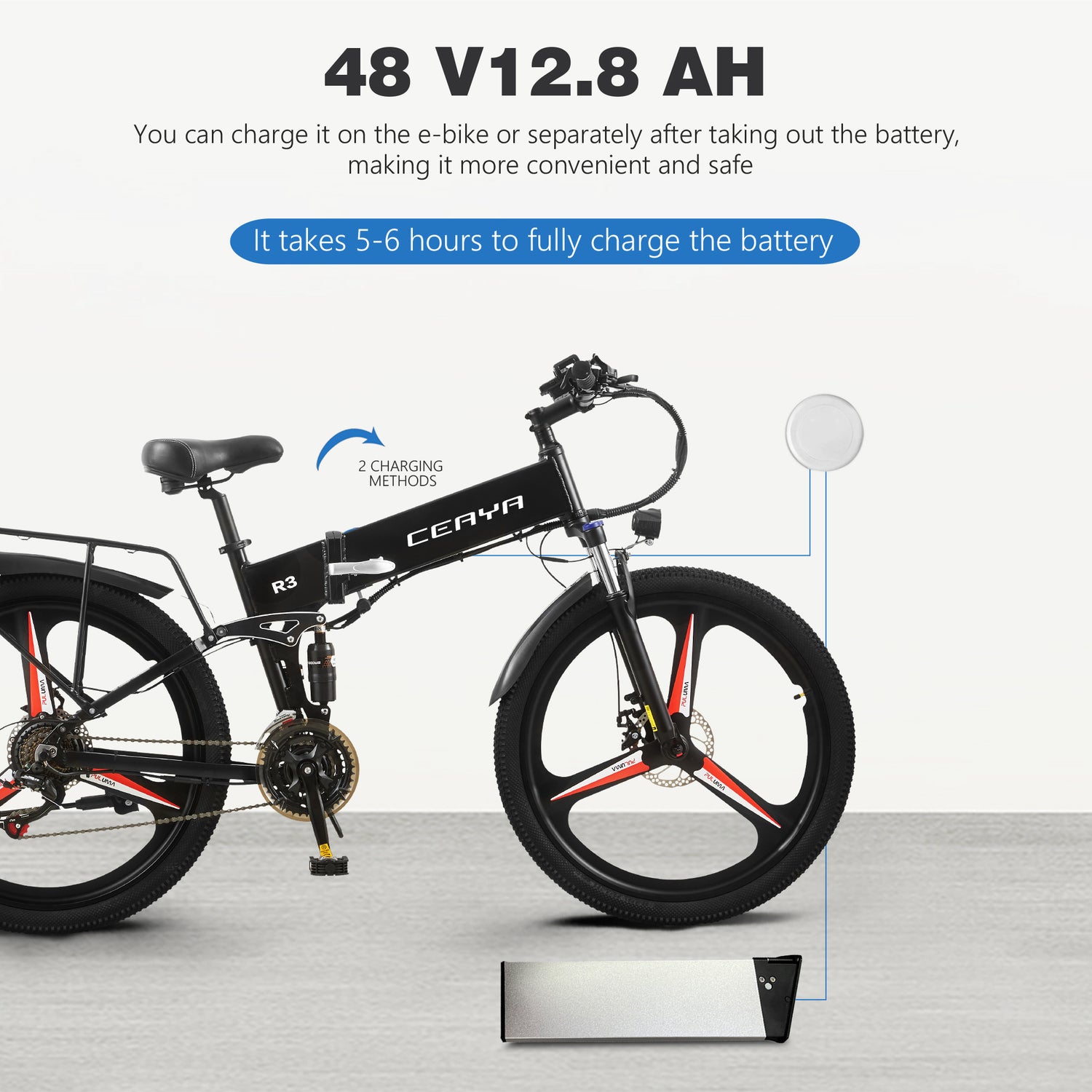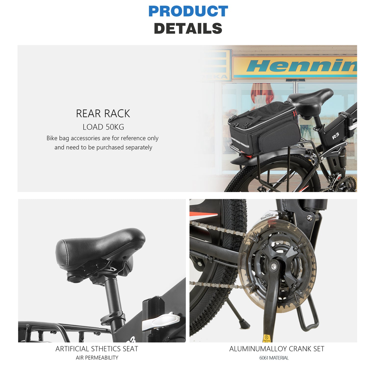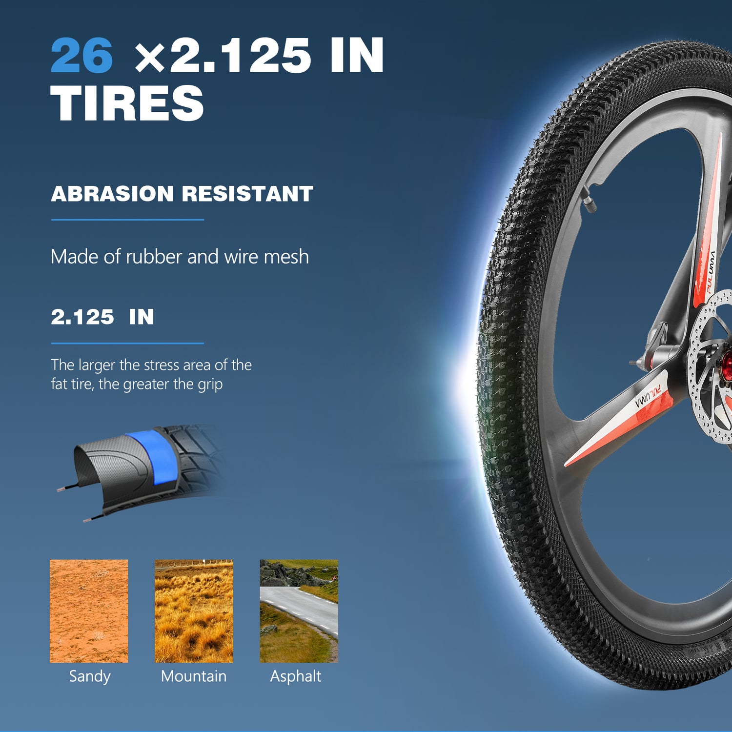 VÉLO À 3 RAYONS : Le VTT électrique R3 est doté d'une roue monobloc à 3 rayons avec un pneu extérieur de 26 x 2,125 pouces. Le matériau est léger et solide, et le pneu est résistant à l'usure, adapté à toutes sortes de conditions de route.
