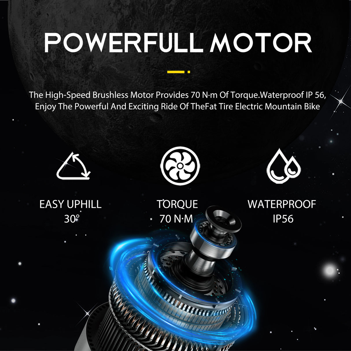 Mocniejszy, szybki silnik 70N-M w piaście tylnej zapewnia dużą moc, dzięki czemu ebike z łatwością pokonuje wzniesienia o nachyleniu 35°.