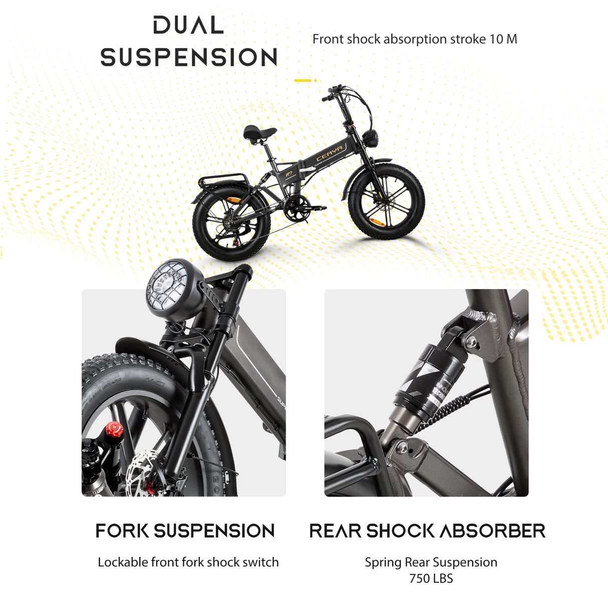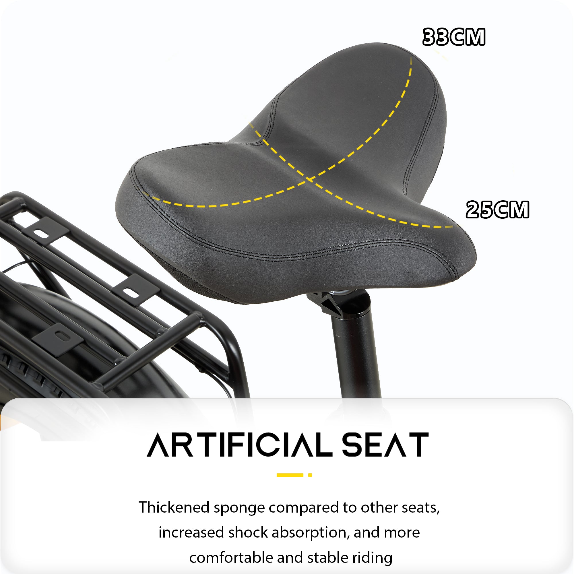 Zastosuj regulowany amortyzator przedniego widelca + niezależną konstrukcję tylnego zawieszenia, w połączeniu z ergonomicznym siedziskiem z pogrubionej gąbki, które może skutecznie zmniejszyć wstrząsy spowodowane nierówną nawierzchnią drogi i zapewnić bardziej komfortową jazdę.