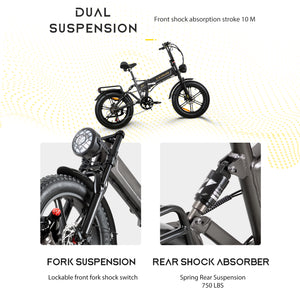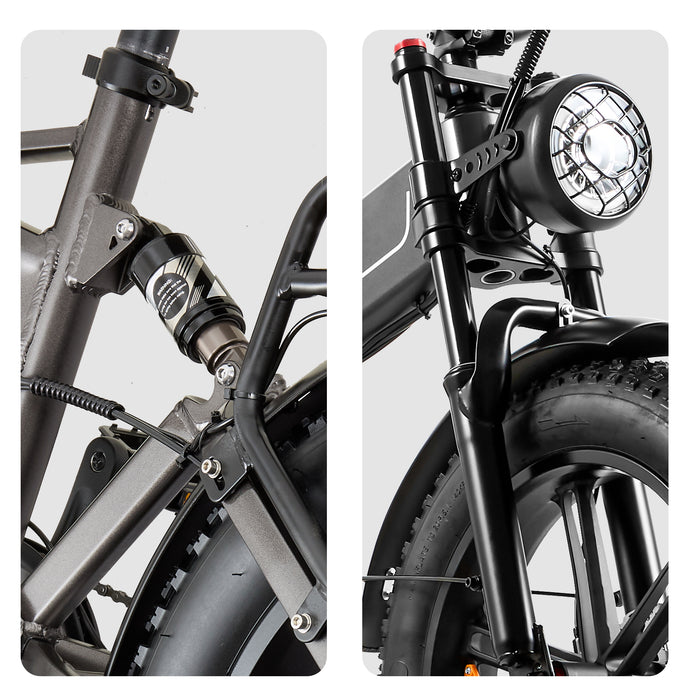 • 【Podwójny system amortyzacji】 Dzięki amortyzowanemu widelcowi ze stopu aluminium i amortyzowanej rurze podsiodłowej składany rower elektryczny dla dorosłych może dostosowywać się do zmian terenu i skutecznie amortyzować wibracje spowodowane nierówną drogą, znacznie poprawiając komfort jazdy.