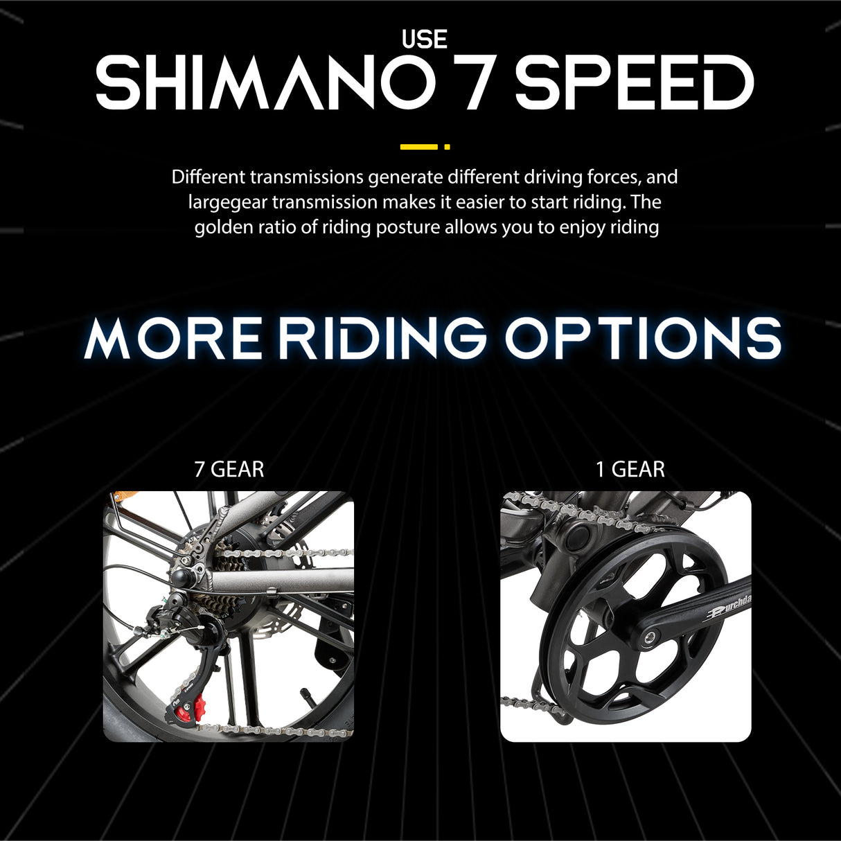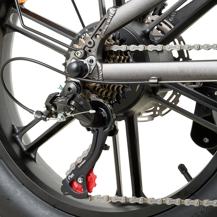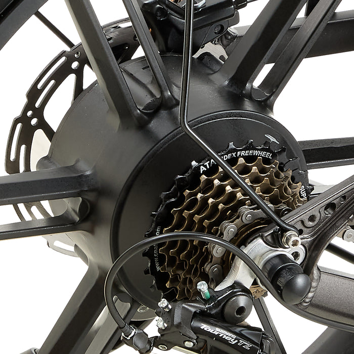 Rower elektryczny jest wyposażony w profesjonalną 7-biegową przekładnię Shimano, która płynnie zmienia biegi w różnych warunkach drogowych.