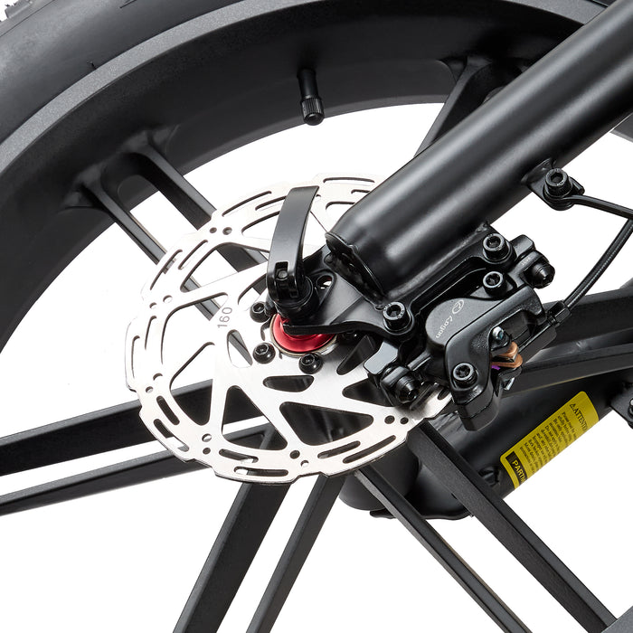 Podwójny hydrauliczny hamulec tarczowy, silnik automatycznie podąża za wyłączonym zasilaniem podczas hamowania. Skutecznie zwiększa to skuteczność hamowania roweru elektrycznego. Tarcze hamulcowe o średnicy 160 mm mają otwory odprowadzające ciepło, aby zapobiec przegrzaniu hamulców.