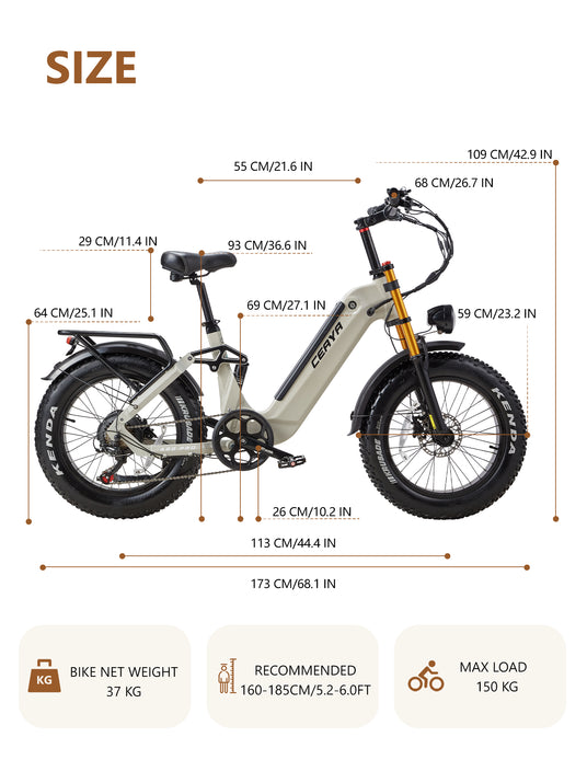 Enjoy the ride with the CEAYA Electric Bike A20 PRO! The compact body packs a powerful 75 NM output with 20’ fat tyres, dual suspension and adjustable handlebars.