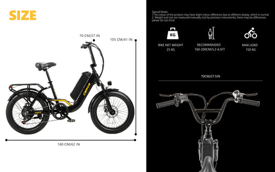 - Compact E-bike: CEAYA Fat ebike R8SE is made of aluminium alloy frame, the whole length of the bike is about 160cm, the weight is about 25kg, and the maximum load is about 150kg. the light weight brings you more flexible and easy riding experience.
